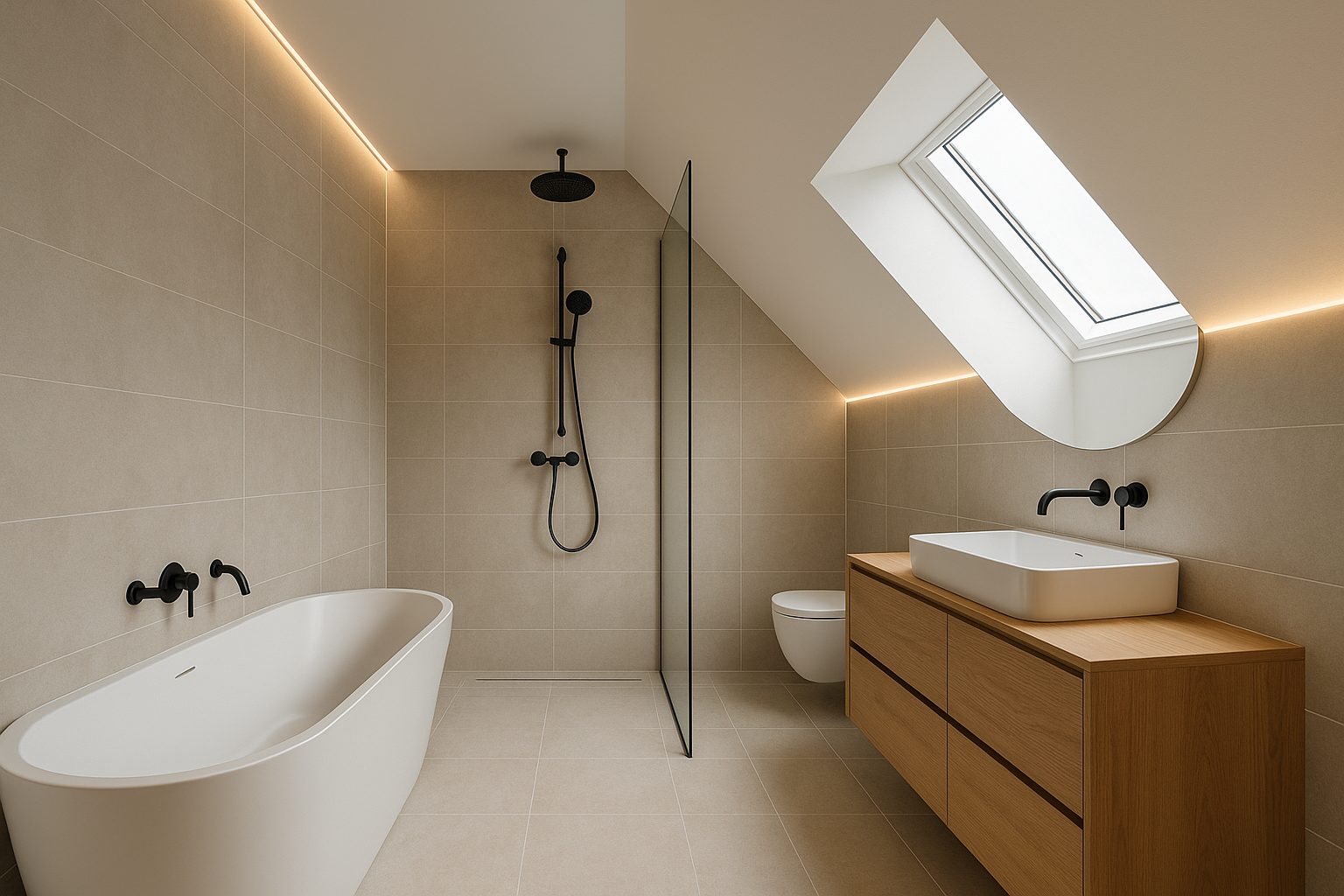 Wir planen dein Dachbad mit Höhen-Check, Licht, Lüftung & Stauraum – inkl. Visualisierung und Materialliste.