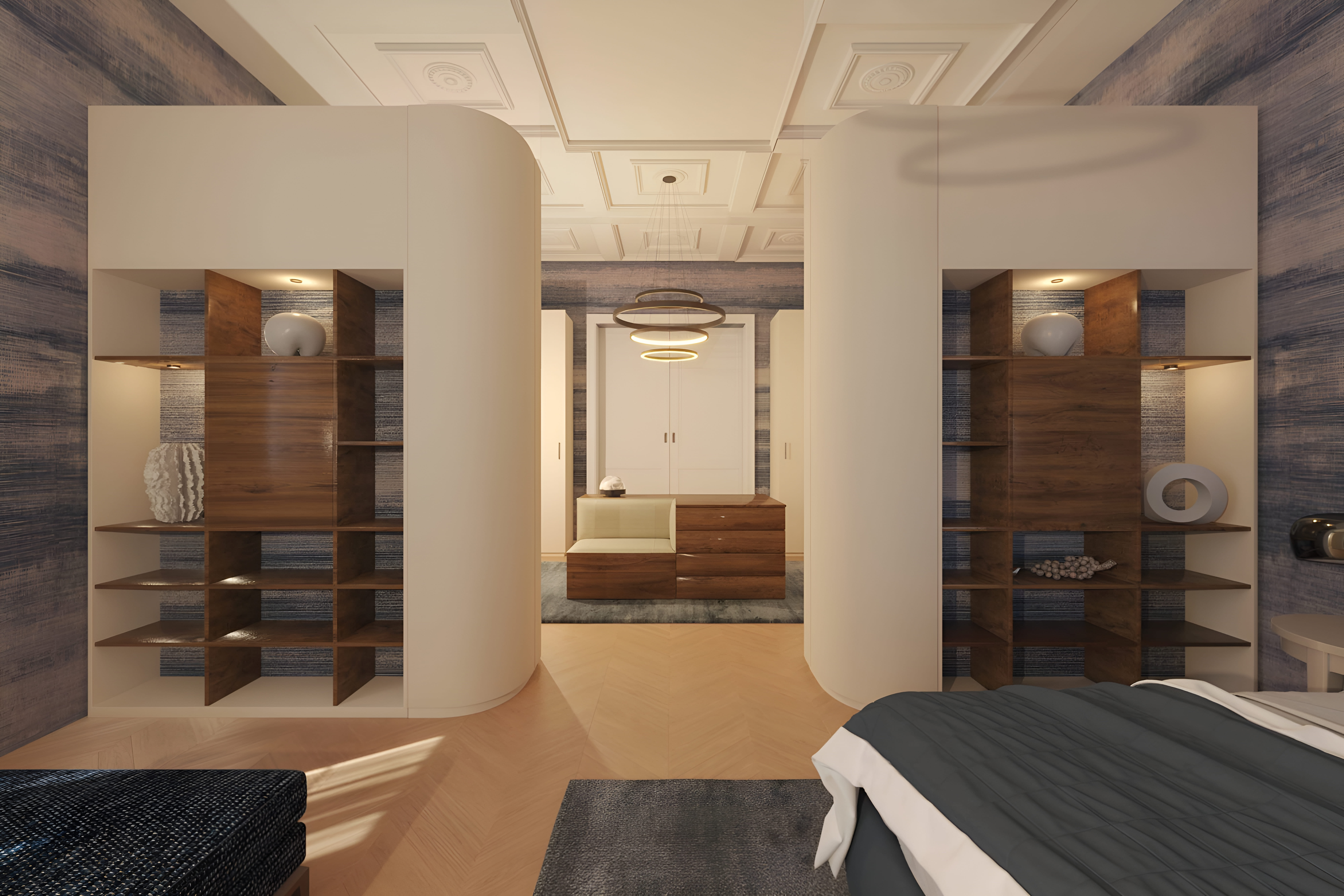 Die Deckengestaltung mit Stuckelementen wird durch moderne Ringpendelleuchten inszeniert, die den Raum subtil zonieren. Seitlich platzierte Regale aus warmem Holz bieten dekorativen Stauraum und bringen natürliche Wärme in das elegante Farbkonzept. Ein dezenter Sitzbereich am Fußende des Bettes schafft zusätzliche Komfortzone – perfekt für ruhige Morgenstunden oder entspannte Abende.