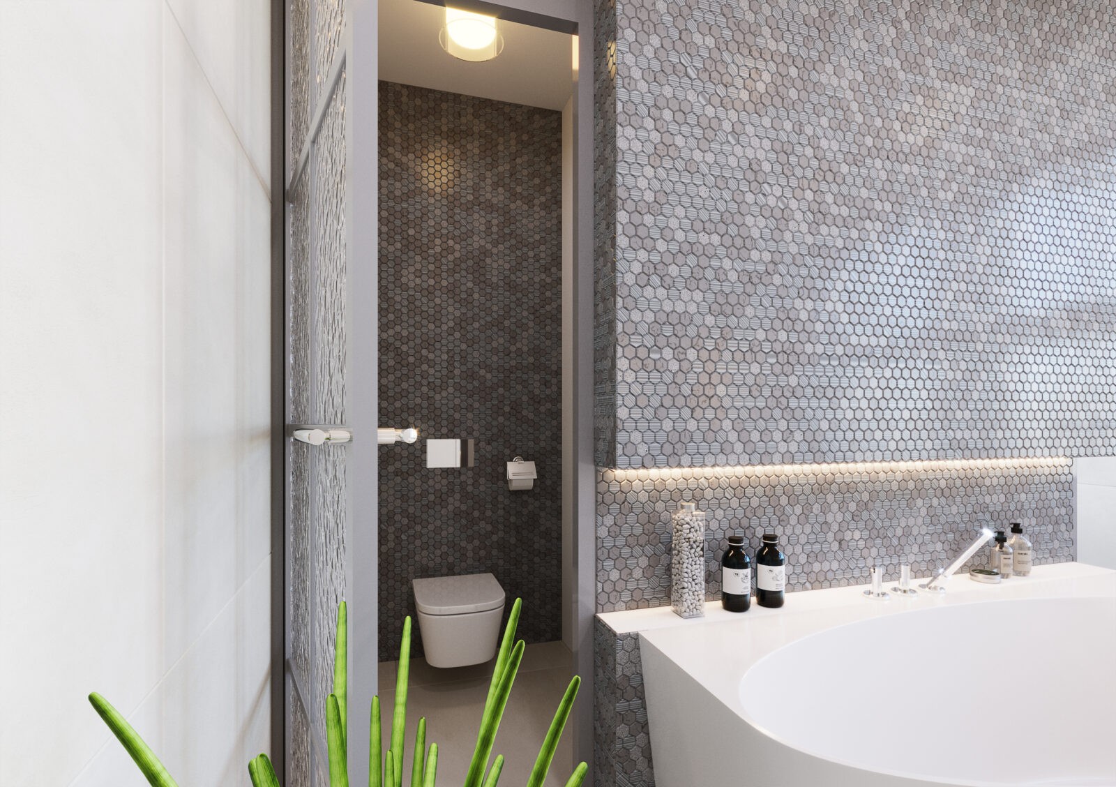 Als Boden–und Wandgestaltung kamen kleinteilige Hexagon–Mosaikfliesen aus Naturstein zum Einsatz–ein stilvolles Statement mitzeitloser Eleganz. Ergänzt wurde das Konzept durch edle Glastüren ausaltem Flaschenglas, die als gestalterisches Detail und Raumtrennerfungieren.